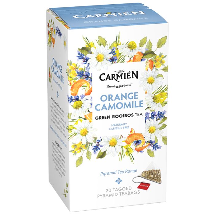Carmién Orange Camomile Pyramid tea is a blend of green rooibos, green honey bush and camomile. The camomile blends beautifully with the slightly perfumed flavour of bergamot orange and creamy vanilla. The tea dreams are made of. Your go-to tea anytime of the day, especially before bedtime. Calming and relaxing.